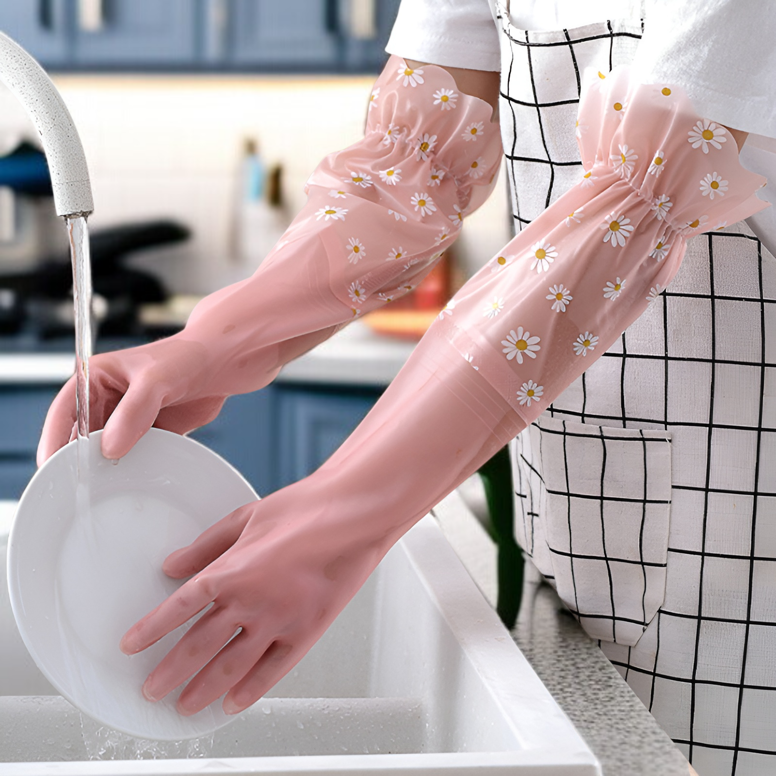● 長めのデザインで腕までしっかりガードし、食器洗いや炊事中の水や洗剤から手肌を守ります。
